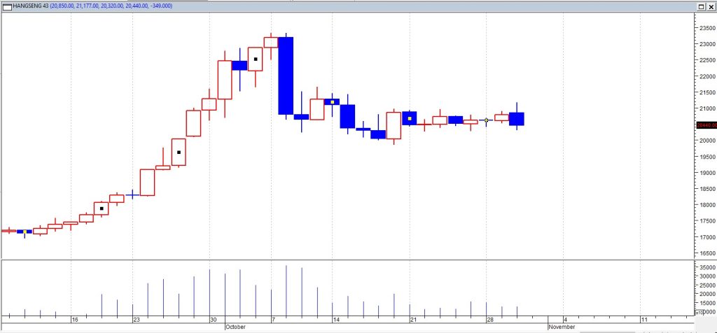 Indeks Hang Seng jatuh 321 poin atau 1,6% pada hari Rabu (30/10), yang menandai penurunan untuk hari kedua secara beruntun di tengah penurunan sektor yang meluas.