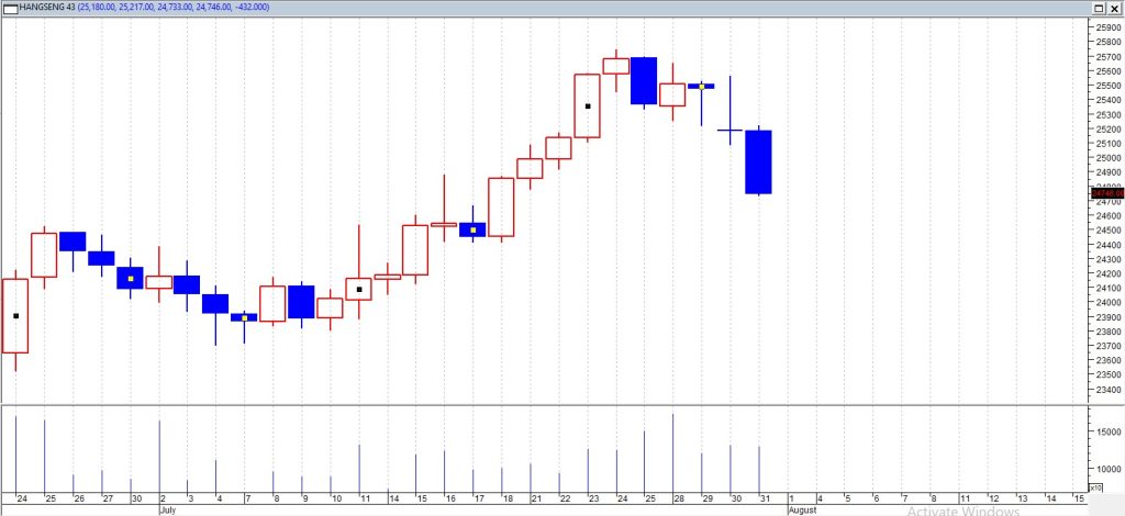 Pasar saham Hong Kong kembali melemah pada perdagangan hari Jumat (01/08). Indeks Hang Seng turun 1,1%. Ini merupakan level penutupan terendah sejak 17 Juli, menandai hari keempat berturut-turut penurunan indeks utama tersebut.