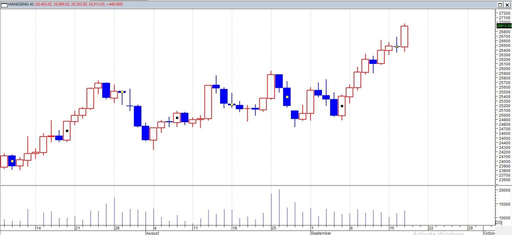 Hang Seng melonjak 470 poin, atau 1,8%, pada hari Rabu,bangkit dari penutupan yang tenang di sesi sebelumnya dan mencapai level tertinggi sejak pertengahan Juli 2021 di tengah penurunan suku bunga Fed yang banyak diharapkan hari ini dan prospek pelonggaran lebih lanjut tahun ini. Indeks teknologi