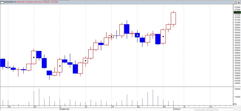 Indeks Hang Seng naik 431 poin, atau 1,6% pada Kamis (2/10), menyentuh level tertinggi dalam lebih dari empat tahun dan mencatat kenaikan untuk sesi ketiga seiring mayoritas sektor menguat. Sektor teknologi memimpin reli, dengan SMIC melesat 13% setelah Samsung dan Hynix mengumumkan kemitraan untuk memasok pusat data OpenAI. Penguat besar lainnya termasuk Kuaishou Tech (8,3%), Tencent (2,6%), dan Meituan (1,5%). Saham konsumen juga mencatat kenaikan kuat setelah data pekerjaan AS yang lemah meningkatkan taruhan pemangkasan suku bunga The Fed. Produsen kendaraan listrik ikut reli; Nio naik 6,6% ke level tertinggi satu tahun setelah membukukan penjualan bulanan dan kuartalan rekor.