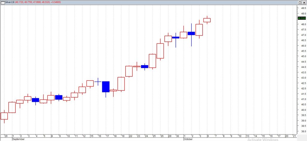 Perak diperdagangkan, melemah dari level tertinggi multi-tahun yang dicapai pada 6 Oktober di tengah aksi ambil untung karena imbal hasil yang lebih kuat meningkatkan biaya peluang logam tersebut. Kurva