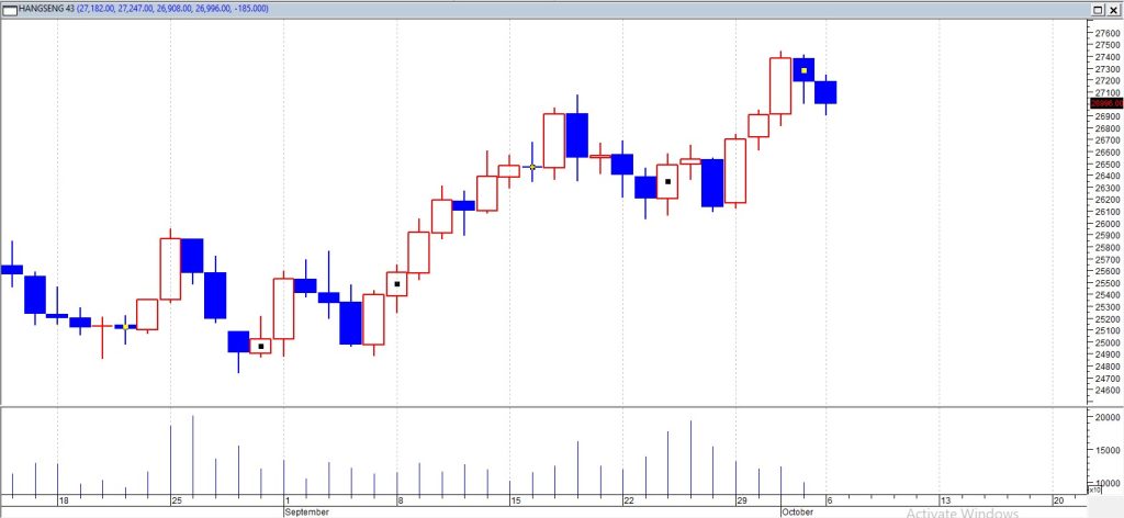 Indeks Hang Seng ditutup turun 0,5% pada hari Rabu (8/10), melemah untuk sesi ketiga berturut-turut karena pelemahan sektor secara luas yang menekan sentimen. Indeks teknologi ini melemah 0,6%, mengikuti pelemahan Wall Street setelah Oracle jatuh karena kekhawatiran margin. Saham- saham unggulan Alibaba turun 1,6%, sementara Baidu (-3,2%), Meituan (-2,3%), dan SMIC (-1,8%) mencatat kerugian tajam, karena anggota parlemen AS dilaporkan mendorong pembatasan yang lebih luas pada ekspor peralatan pembuat chip ke Tiongkok. Saham-saham keuangan dan konsumen juga melemah, tertekan oleh kekhawatiran atas pemulihan ekonomi Tiongkok yang melambat, diperburuk oleh cuaca buruk baru-baru ini. Sebaliknya, saham-saham pertambangan emas menguat karena harga emas batangan melanjutkan rekor tertingginya, dengan Shandong Gold Mining melonjak 7,5% dan Zhaojin Mining naik 3,7%. Pasar memangkas kerugian awal setelah Bank Dunia menaikkan proyeksi pertumbuhan Tiongkok 2025 menjadi 4,8% dari 4,0%, meningkatkan harapan akan stimulus lebih lanjut untuk mendukung target pertumbuhan Beijing sebesar 5%. Sementara itu, pasar di daratan Tiongkok akan dibuka kembali pada hari Kamis, yang berpotensi mendorong momentum.