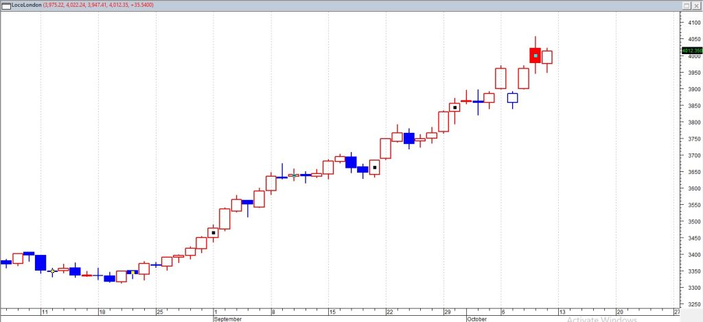 Emas spot melesat melewati level $4.000 pada Jumat (10/10), mendekati rekor tertinggi $4.059 yang dicapai pada Rabu, didorong oleh memanasnya kembali ketegangan antara Washington dan Beijing setelah Presiden AS Donald Trump menyatakan tidak ada alasan untuk bertemu Presiden Tiongkok Xi Jinping dalam dua minggu kedepan di Korea Selatan seperti yang direncanakan, sambil menyiapkan kenaikan tarif atas impor dari Tiongkok. Sementara itu, pemerintah Israel pada Jumat meratifikasi gencatan senjata dengan Hamas, yang membuka jalan untuk menghentikan permusuhan di Gaza dalam 24 jam. Sepanjang tahun ini, harga emas telah naik sekitar 52% dan berada di jalur kenaikan mingguan