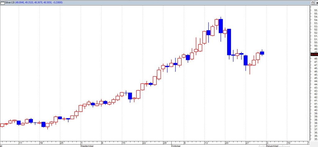 Perak naik di atas $49 per ons pada hari Jumat dan diperkirakan akan mengakhiri pekan ini sedikit lebih tinggi karena meningkatnya volatilitas pasar mendorong permintaan aset safe haven. Saham global mengalami fluktuasi tajam pekan ini di tengah meningkatnya kekhawatiran atas belanja infrastruktur AI, sementara pemangkasan suku bunga terbaru Federal Reserve dan pertemuan Trump-Xi hanya memberikan sedikit dukungan baru. The Fed memberikan pemangkasan suku bunga seperempat poin yang telah lama diantisipasi awal pekan ini, meskipun Ketua Jerome Powell memperingatkan bahwa pemangkasan suku bunga lagi pada bulan Desember tidak dijamin. Pertemuan antara Presiden Trump dan Xi juga diakhiri dengan beberapa konsesi perdagangan dari kedua belah pihak,tetapi tidak ada perkembangan besar yang mengejutkan pasar. Sementara itu, suku bunga sewa perak di London turun dari rekor tertinggi, menunjukkan peningkatan likuiditas pasar. Awal bulan ini, perak mencapai rekor tertinggi selama short squeeze dan krisis likuiditas di London sebelum melemah akibat aksi ambil untung.